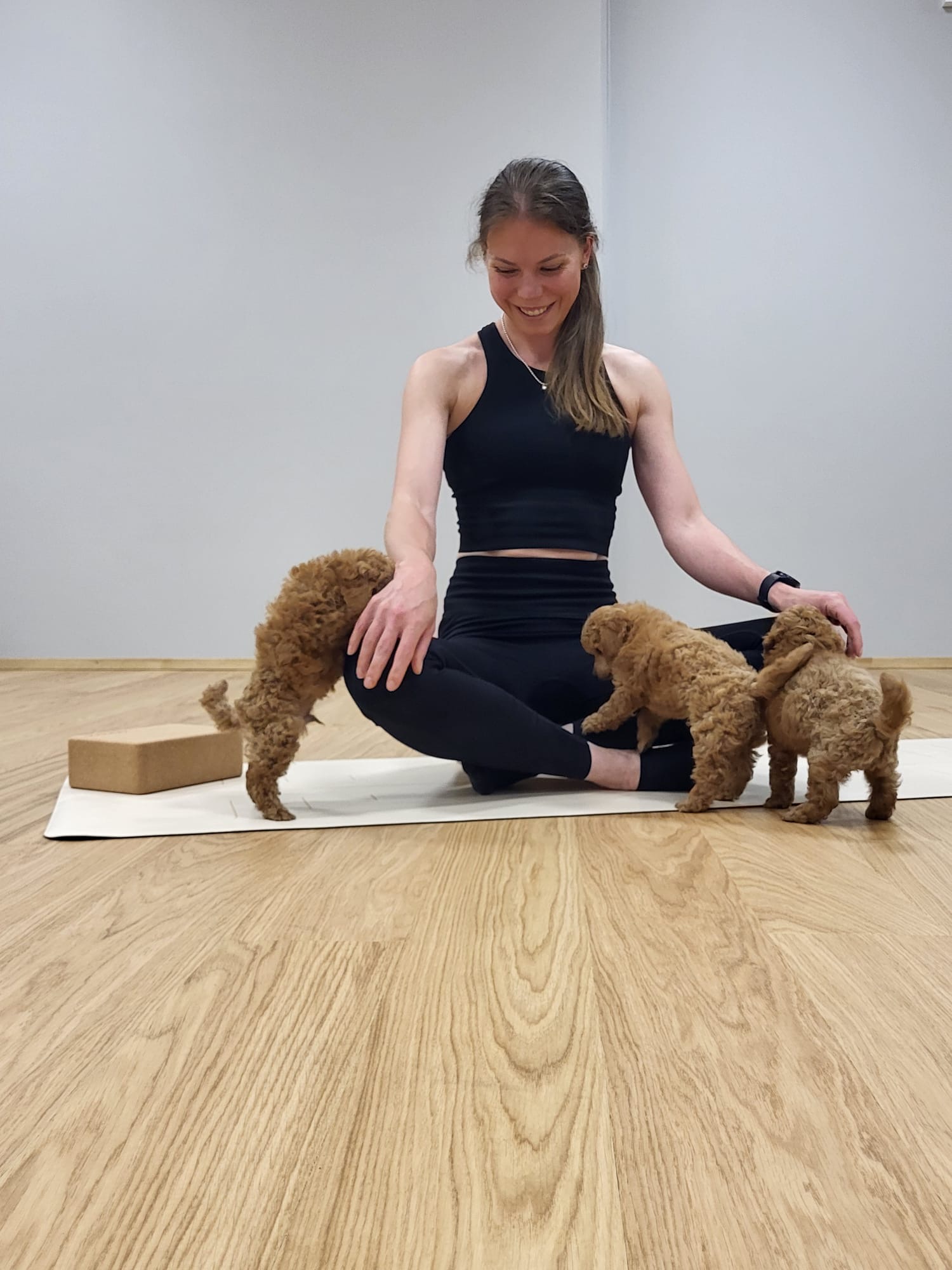 Tunnilla tehdään jooga-asanoita lattiatasossa ja nautitaan koiranpentujen seurasta.