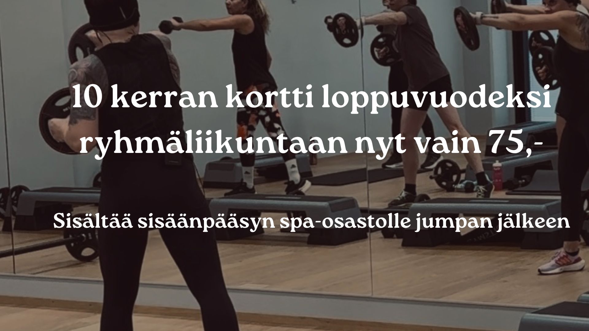 Loppuvuoden ajaksi 10xkortti ryhmäliikuntaan vain 75€. Sisältää myös pääsyn spa-osastolle jumpan jälkeen. Lue lisää monipuolisesta ryhmäliikuntatarjonnastamme: Ryhmäliikunta – XO Center